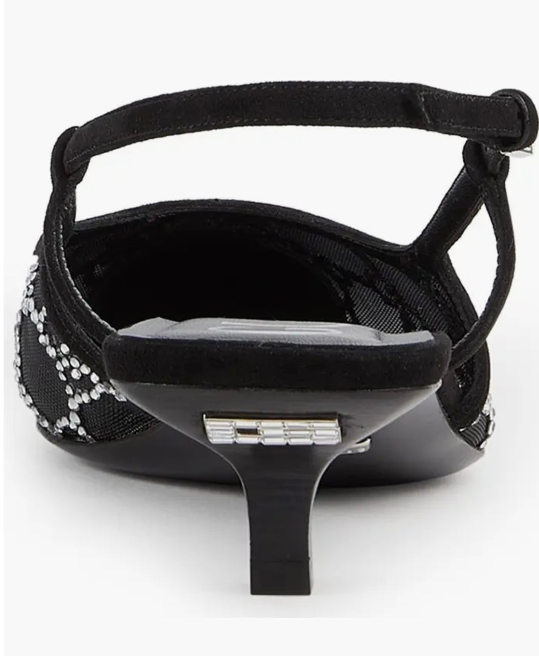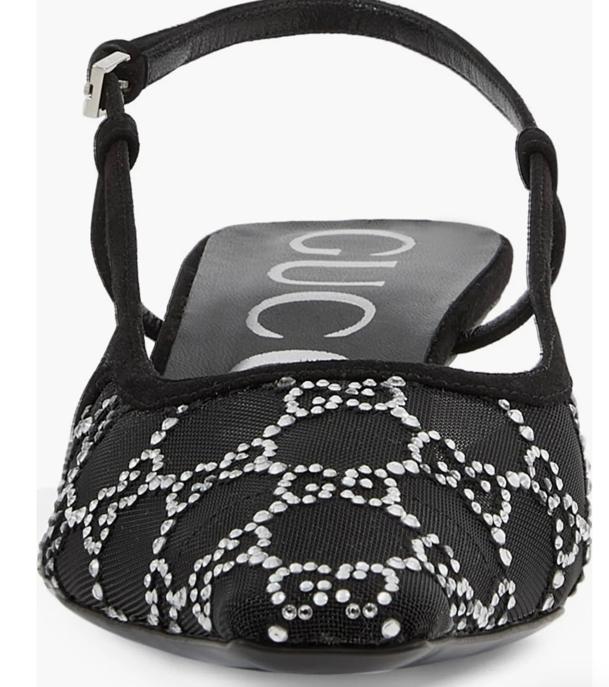 Gucci's heritage monogram goes glam in sparkling crystals on this sheer mesh slingback refined with suede trim and a stacked kitten heel. This pump is part of the Aria collection, which references archival pieces from the