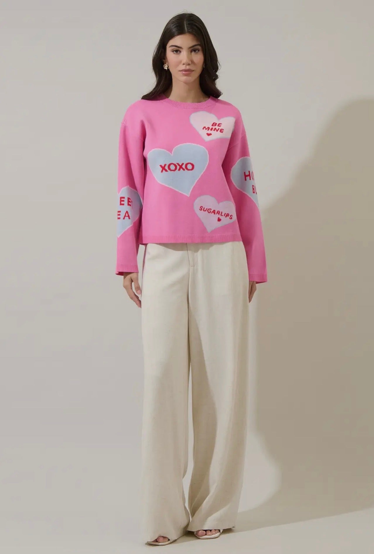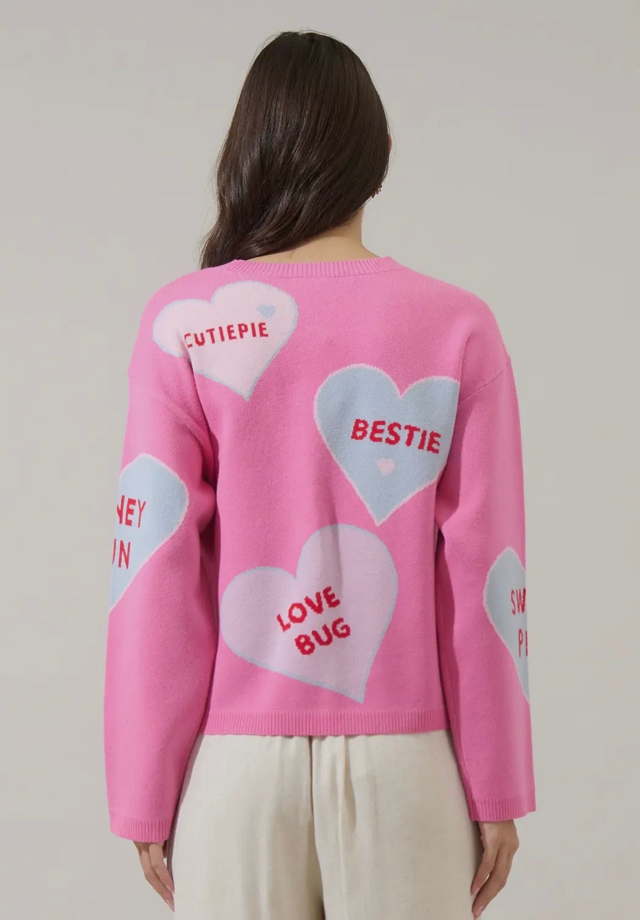 Spread the love and sweetness with this adorable sweater. Crafted from a super soft, cozy knit, this crewneck offers a relaxed fit, with long sleeves. The edges have a ribbed design.